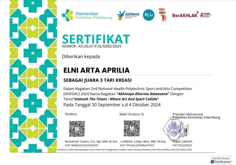 Elni Arta Aprillia, dari mahasiswa Poltekkes Kemenkes Palembang meraih Juara 3 dalam cabang Lomba Tari Kreasi.